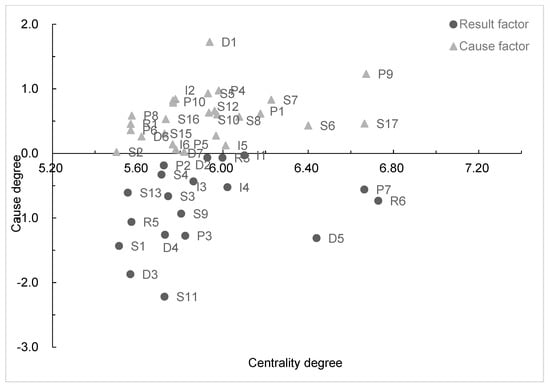 As shown in Figure 3, the influencing factors belonging to the cause factors in the process of data element value release in smart cities are D1, D6, D7, P1, P4, P5, P6, P8, P9, P10, S2, S5, S6, S7, S8, S10, S12, S14, S15, S16, S17, I2, I5, I6, R1, R2, R4, and R7. Among them, the socio-economic level (D1) ranks 1st in the degree of cause and 3rd in the degree of influence, while the degree of being influenced ranks at the bottom, indicating that this influencing factor has an extremely strong initiative and has a great possibility of affecting other influencing factors in the process of releasing the value of smart city data elements, but is not easily affected. Similarly, there are data privacy protection (P9), data computing technology (P4), and data element authenticity (S5), etc. The above-mentioned influencing factors are in the top of the list for both the degree of cause and the degree of influence, showing a strong initiative.