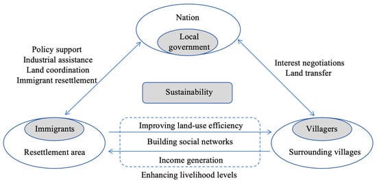 Based on policy support and industrial assistance, the idle farmland around the resettlement area holds significant economic potential. This study proposes a shared farmland resource model for the areas surrounding the resettlement zone. On one hand, the government coordinates the transfer of large tracts of idle farmland around the resettlement area to the settlement through land transfer mechanisms. The resettlement area utilizes this land to develop agricultural industries and provides industrial training, attracting migrants with farming skills to participate. Surrounding villagers can either lease their land for transfer and receive dividends or receive annual rental income from the land transfer. On the other hand, migrants can enter into land contracting agreements with surrounding villagers, independently transferring fragmented sloped land for subsistence farming, which provides additional income for their families. Villagers, in turn, can successfully lease out idle farmland that is unsuitable for large-scale transfer, increasing their income. This model not only helps migrants enhance their livelihood capital but also offers an opportunity for surrounding villagers to increase their income. It also greatly promotes interactions between migrants and surrounding villagers, strengthens their social networks, and contributes to the sustainable development of the resettlement area and its surrounding regions [43]. The model is shown in Figure 1.