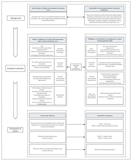 In China’s process of relocation for poverty alleviation, the rational development and utilization of idle farmland in urbanized resettlement areas and surrounding villages can achieve multiple goals related to sustainable development [45]. These goals are closely aligned with the United Nations’ Sustainable Development Goals (SDGs), particularly in terms of the coordinated development of the economy, society, and environment. First, reintroducing idle farmland into modern, specialized, and ecological agricultural production can increase the income of both the surrounding villagers and migrants, promote livelihood diversification, and help impoverished groups escape poverty, directly contributing to the achievement of SDG 1 (No Poverty) and SDG 2 (Zero Hunger) [46,47]. Second, the development of idle farmland is not limited to agricultural production. As some of the land is located in ecologically fragile areas, attention should be paid to ecological conservation and restoration during the development process. Through ecological restoration, carbon sink capacity can be enhanced, helping achieve SDG 13 (Climate Action) and SDG 15 (Life on Land). Finally, the rational use of idle farmland can contribute to improving the sustainable management of water and land resources, thereby promoting the achievement of SDG 6 (Clean Water and Sanitation). Based on this analysis, this study constructs an analytical framework for studying the coupling between the demand for farmland transfer-in by resettled migrants and the supply potential for farmland transfer-out by surrounding villagers (see Figure 2).