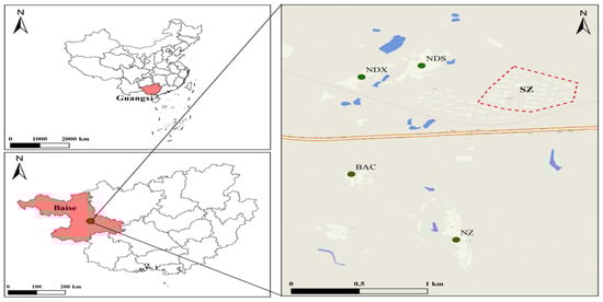 This study is based on the SZ relocation settlement area in BS City, Guangxi, China. SZ is the largest cross-county relocation settlement for poverty alleviation in Guangxi, covering an area of 565 mu with a total building area of 623,700 square meters. The landless resettlement program has relocated 4285 households, totaling 18,419 people, from 304 villages in 57 surrounding townships. The location of the SZ resettlement area is shown in Figure 3.
