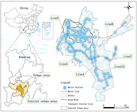 The Chinese official guidelines recommend a subway station buffer zone radius of 500–800 m (Ministry of Housing and Urban–Rural Development of the People’s Republic of China, 2015). Considering the scale of Kunming, this study adopted an 800 m Euclidean radius as the buffer zone around each subway station and calculated the value of each indicator within this area. The balanced comprehensive indicator system is presented in Table 1.