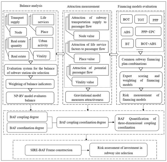 This paper establishes a three-dimensional subway site risk assessment framework (SIRE-BAF) to evaluate the rationality of subway station (or line) site selection by integrating the factors of balance, attractiveness, and financing model. The technical process of this framework is illustrated in Figure 2.