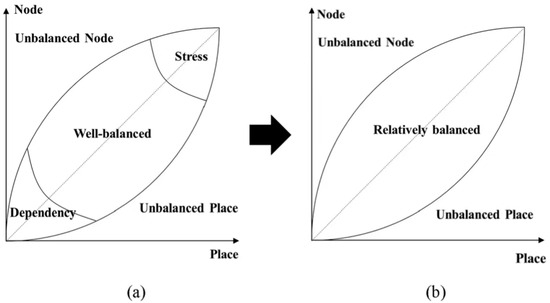 The NP model highlights mismatches between local transport supply or city accessibility (node values) and the intensity and diversity of urban development (place values) [51]. The original NP model is illustrated in Figure 3a. “Well-balanced” areas represent subway stations with sustainable development, where node and place values are in balance. “Stress” areas indicate that further development of these stations could lead to conflicts between limited transport supply and high urban vitality [52]. In contrast, “Dependency” areas suggest a need for further development, as both node and place values are low. Additionally, the “Unbalanced Node” scenario reflects a relatively more developed transport system in relation to urban activity around the station, opposite to the “Unbalanced Place” scenario [53].