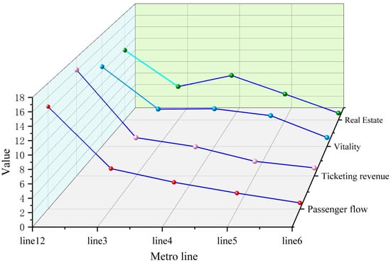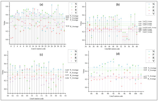 This study calculated the scores of each sub-dimension of balance using indicator weights and plots scatter diagrams, as shown in Figure 4. Due to the smaller number of stations on Lines 3 and 6, they are combined in Figure 4b. In this figure, “X_Average” represents the average score of the corresponding dimension for each subway line, with the correspondence between code and station provided in Appendix B. Figure 4 shows that within the comparison of the same dimension, the average scores of the sub-stations on Line 12 are higher than those on other lines.