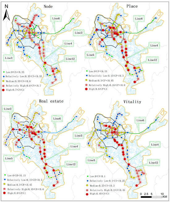 Figure 5 illustrates the spatial variation in composite scores across different balance dimensions among the stations. Due to substantial differences in the score distributions of each dimension, this study applied the natural breaks method in ArcGIS 10.8.1 to identify “natural” division points by minimizing variance within categories and maximizing variance between them. This method divides each dimension’s scores into five levels: low, relatively low, medium, relatively high, and high. The figure shows that balance results across dimensions exhibited two spatial patterns: core–periphery and axis distribution. These patterns are reflected in the following ways: within the Second Ring Road in Kunming’s main urban area, displays a clear clustering of “medium and high score” stations across different dimensions. Outside the Second Ring Road, station scores across dimensions tend to align along the transit line, forming a continuous distribution of high or medium-low scores along the axis, with notable differences in scores by line. This spatial distribution pattern suggests that management should adjust train frequency and schedules based on passenger flow characteristics in core and peripheral areas as well as on different subway lines. Additionally, coordination of surrounding land use and traffic layout is essential to foster balanced development between core and peripheral areas.