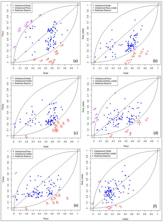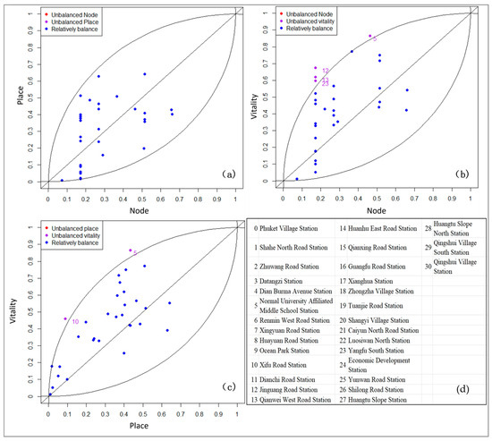 Figure 6e shows the imbalance in the PV dimension. A place imbalance indicates that land use is abundant, but regional vitality is low, which may lead to lower passenger flow at subway stations and impact operating income. Management should carefully analyze and monitor these sites to prevent future imbalances. Conversely, the two stations with a vitality imbalance experience high passenger flow but limited land use diversity, highlighting the need to optimize land use structure and unlock regional potential.
