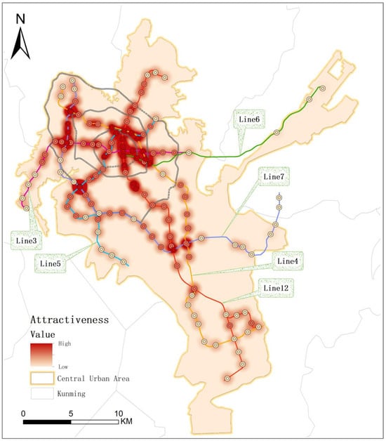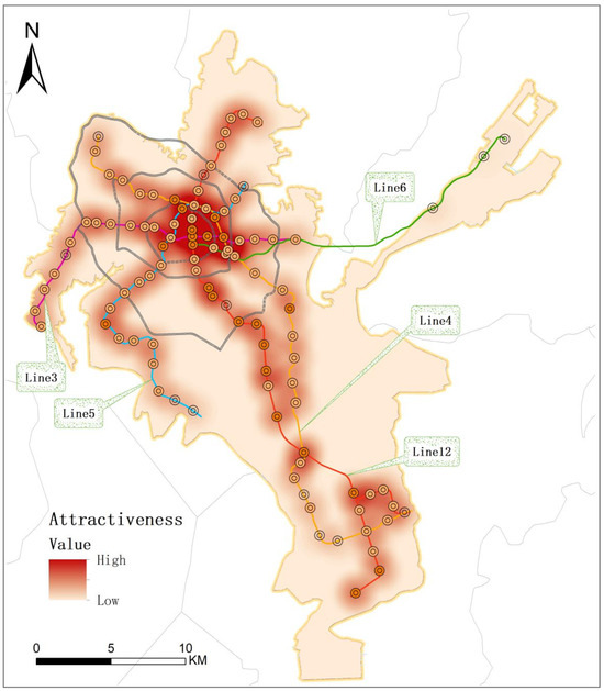 Station attractiveness results from a combination of transport provision, surrounding land use, and potential patronage. Figure 7 illustrates differences in attractiveness across stations. The figure shows that the most attractive stations are primarily located in and around the city’s Second Ring Road. Outside the Second Ring Road, the more attractive stations are mostly interchange stations and Line 12 subway stations, followed by Lines 3, 4, and 5, while Line 6 stations are the least attractive.