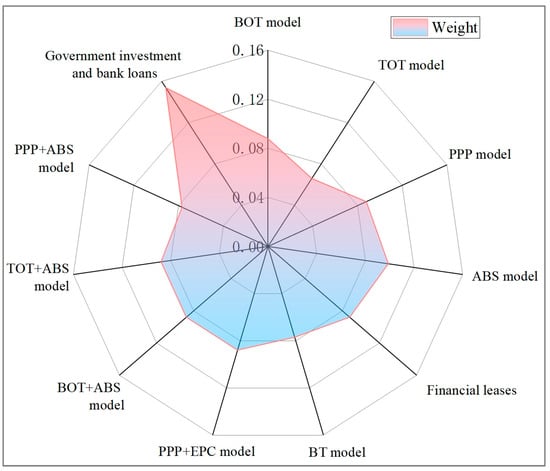 This study applied the AHP method to calculate weights based on the expert scoring results, with the findings presented in Figure 8. The AHP judgment matrix and consistency test are provided in Appendix C. Based on expert scores from this study, the “government investment + bank loan” model presents the lowest investment risk among financing models for subway construction in Kunming, while the TOT model is associated with the highest risk.