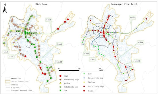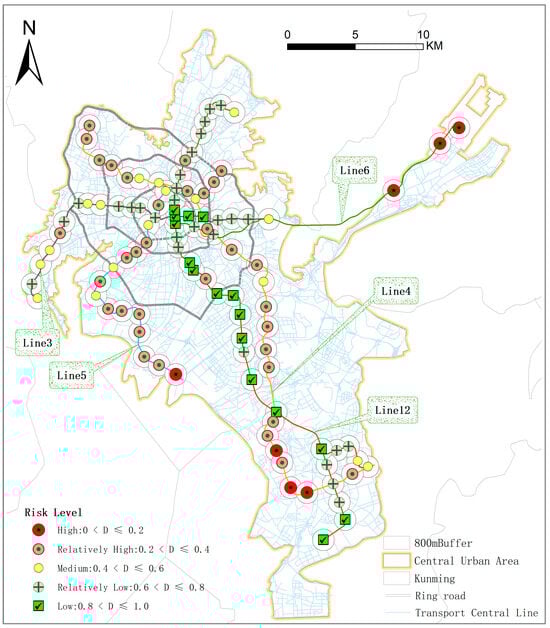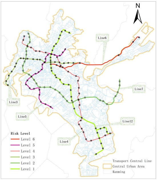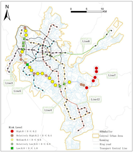 Figure 9 reveals significant spatial heterogeneity in the risk evaluation results. In terms of proximity to the city center, a higher proportion of low-risk sites can be observed within the Third Ring Road, while high-risk sites are more prevalent outside it. By line distribution, lower risk is primarily associated with stations on Line 12, Line 3, and various interchange stations. Line 4 stations are mostly medium-to-high risk, Line 5 and Line 6 stations within the Second Ring Road are medium-to-low risk, while those outside the Second Ring Road are predominantly medium or high risk.