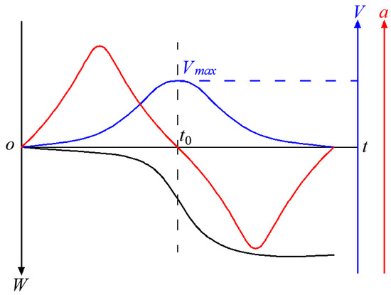 The curve corresponding to Formula (1) itself and its first-order derivation (subsidence velocity V) and second-order derivation (subsidence acceleration a) is shown in Figure 2. When a is 0, V is the maximum value, and W reaches the inflection point. When t = 0, W, V and a subsidence acceleration are all 0. When t = ∞, the subsidence is W0, and V and a are all 0. The variation process of W, V, and a satisfy the law of 0 → W0, 0 → Vmax → 0, 0 → amax → 0 → amin → 0, respectively. The variation curves of the three align with the actual subsidence process of any surface point, it shows that the completeness of the Weibull time function is good. Completeness means that the elements with property p are in the set; that is, given a set S and an operation rule, if the elements in the set are closed under the operation rule, then the set S is complete under the operation rule. The subsidence characteristics satisfy one algorithm, respectively, and can be expressed by the Weibull time function itself, first-order derivation, and second-order derivation. Therefore, it can be said that the Weibull function is complete.