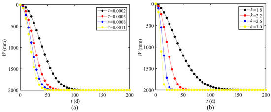 The influence of c and k on the subsidence curve: (a) the influence of parameters c (k = 2.2); (b) the influence of parameters k (c = 0.0008).