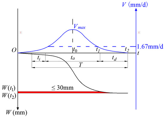 Surface damage has the characteristics of continuity, regularity, and complexity. In the field of mining subsidence science, the surface subsidence velocity (V) reflects the intensity of surface subsidence (W). Based on the influence of surface subsidence velocity on buildings, many scientists divide the entire subsidence process into three stages: the initial stage (ti), the active stage (ta), and the decline stage (td), as shown in Figure 5 [5,40,41,42,43]. The surface point at which the subsidence reaches 10 mm marks the commencement of the subsidence process. The initial stage of subsidence extends from the beginning of W = 10 mm to V = 1.67 mm/d (50 mm/month). The V of the surface point is greater than or equal to 1.67 mm/d (50 mm/month), it is the active stage of subsidence. When V of the surface point is less than 1.67 mm/d (50 mm/month) and the cumulative subsidence in 6 months does not exceed 30 mm, it is the decline stage of subsidence. Although numerous factors influence surface subsidence, they primarily affect the duration of each subsidence stage. The critical values defined for each subsidence stage remain constant, reflecting a consensus among scientists [5,40,41,42,43]. The sum of the time experienced by these three stages is the surface subsidence duration (T), expressed as Formula (2). The surface subsidence duration is an important index to judge the stability of surface stable. The accurate prediction of this is essential for the stability evaluation of ground infrastructures [40].