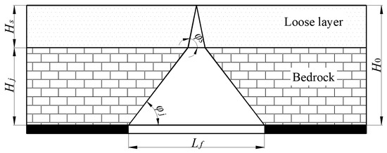 Surface damage is the coupling result of rock breaking and topsoil deformation; the critical size can also be calculated by the full mining angle of the two (Figure 6) [45,46,47]. Lf is: