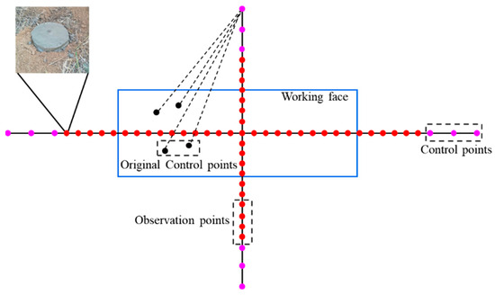 Before mining the working face, technicians usually arrange two mutually perpendicular observation lines in the main section and inclination of the surface. Each observation line consists of multiple observation points, with the length of the lines, the density, and the number of points being related to the geological and mining conditions of each area. The observation process is generally divided into connection measurement, comprehensive measurement, and daily observation. Connection measurement is employed to ascertain the relative positional relationship between the observation station and the working face. Typically, the horizontal position and elevation of the control points are determined using existing control points within the mining area. Comprehensive measurement establishes the initial coordinates and elevation of the observation points, usually conducted twice before mining, with a time interval of no more than five days. Daily observation assesses the subsidence of observation points at varying distances from the advancing working face, with the number of observations adjustable according to operational accuracy. Given that the dataset collected in this paper originates from different mining areas across various literature, a detailed understanding of the layout of each observation station is not feasible. Therefore, we provide a schematic diagram of a surface movement observation station (Figure 7).