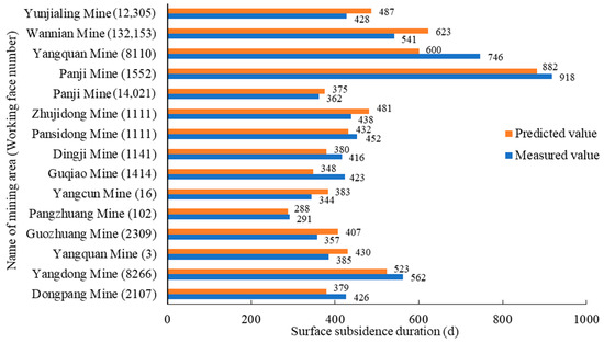 Figure 8 shows the predicted and measured values of the surface subsidence duration in 15 mining areas. The predicted value is basically consistent with the measured value, and the prediction accuracy is high. Combined with Table 1 and Table 4, the mining depth varies from 99 m to 920 m, the mining speed of the working face varies from 1.30 m/d to 6.20 m/d, the coal seam thickness varies from 1.3 m to 7.1 m, and the surface maximum subsidence varies from 750 mm to 4620 mm, thereby encompassing different geological mining conditions. The prediction results of the surface subsidence duration are similar to the measured results. The minimum difference between the two is 3 d, the maximum difference is 146 d, and the average difference is 49 d. Although the predicted value of the 8110 working face in Yangquan mine is quite different from the measured value (146 d), the relative error of the sample is only 19.6%, and the prediction accuracy of a single sample cannot reflect the overall accuracy. The prediction results of the proposed model align closely with the measured results, demonstrating suitability for predicting surface subsidence duration across various geological mining conditions and exhibiting strong applicability.