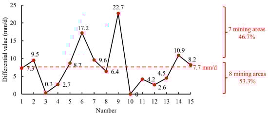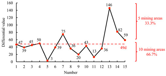 It can be seen from Table 4 that the standard deviation of the surface subsidence duration model proposed in this paper is 61 d, with a relative standard deviation of 6.6%. The prediction accuracy satisfies the requirements of field engineering applications. Therefore, the theoretical prediction will also produce certain errors. Figure 9 shows the difference value distribution of the surface subsidence duration in 15 mining areas. The difference value of 5 mining areas is above the average value, accounting for 33.3%, and the difference value of 10 mining areas is below the average value, accounting for 66.7%. On the one hand, there are some errors in the field monitoring instruments and means. On the other hand, when predicting the surface subsidence duration, the critical size coefficient is 1.4, and different mining areas are also different. However, the average difference is only 49 d, and the relative standard deviation is only 6.6%, which is enough to prove that the established model has high accuracy. It shows that the prediction model of the surface subsidence duration established has high accuracy, further confirming its accuracy and reliability.