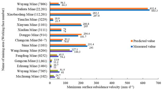 The predicted and measured values of the surface maximum subsidence velocity in 15 mining areas under different methods.