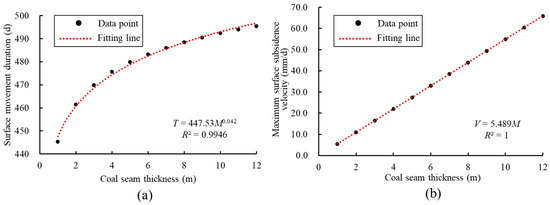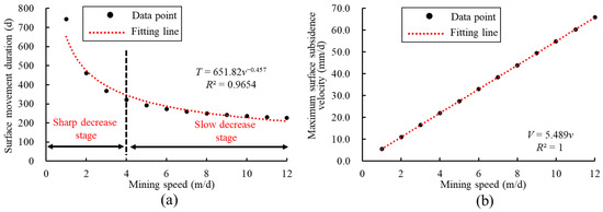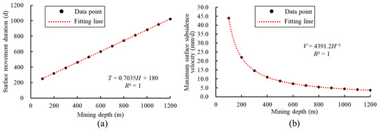 By substituting Formula (14) and Formula (16) into Formula (7) and Formula (11), respectively, the expressions of the surface subsidence duration and the maximum subsidence velocity can be obtained, respectively. The two prediction models established can consider the comprehensive influence of mining parameters, and their applicability is more extensive.