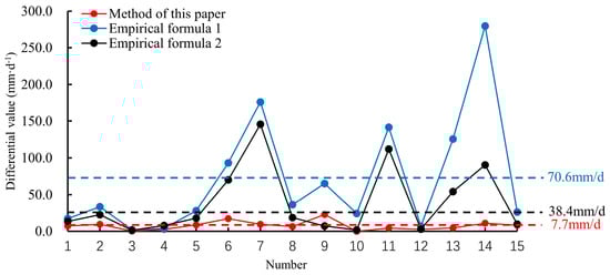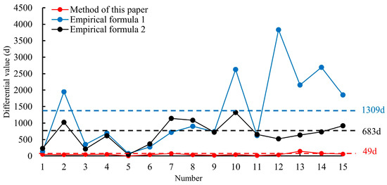 Figure 15 is the difference value distribution of the surface subsidence duration in 15 mining areas under different methods. It can be seen that the average difference between the two empirical formulas is more than 500 d. When the mining depth is large, the prediction accuracy is low, and the applicability is poor. The average difference obtained by the prediction model is only 49 d, and it is suitable for predicting the surface subsidence duration with strong applicability.