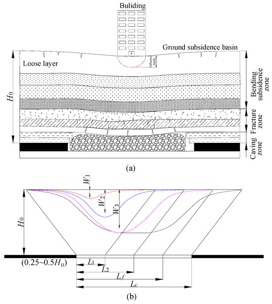 When the working face is mined, the rock strata around the goaf lose support and move, bend, and destroy into the goaf. The surface subsidence occurs from the original elevation, which will form a subsidence basin [49]. During coal mining, the movement and failure of the overlying strata have zoning. When, near the surface, the damage degree gradually weakens, the damage range gradually increases. In general, the overlying strata will form “three zones”, that is, the bending subsidence, the caving zone, and the fracture zone (Figure 17a). When the mining thickness is relatively small, they only form “two zones”. Among them, the caving zone refers to the rock strata that collapses to the goaf in an irregular shape, and there are many voids. It is a channel for water and sediment to break into the underground. The height is generally 3~4 times the coal seam thickness. There are cracks and bed separation cracks obliquely crossing the rock strata in the fracture zone. The bed separation crack is the channel of water conduction, resulting in the surface subsidence being less than the coal seam thickness. The height is generally 9~28 times the coal thickness. The curved subsidence zone moves as a whole [39]. The surface above the bending subsidence zone will form a subsidence basin, and the tensile cracks often appear at the basin edge, extending downward in a “V” shape.