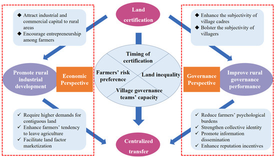 As illustrated in Figure 1, the positive role of land certification on centralized transfer is mainly achieved by both economic and governance perspectives, including promoting rural industrial development and improving rural governance performance.