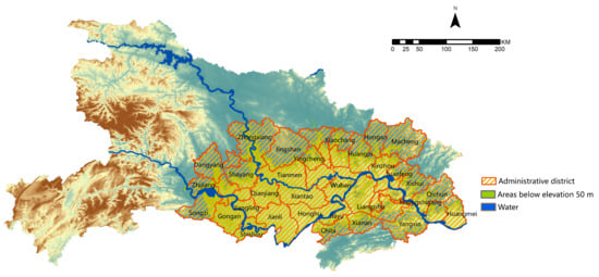 The Jianghan Plain, located in the south–central region of Hubei Province, China, spans approximately 46% of the province’s total land area. It extends from Yichang City in the west to Huangmei City in the east and is bordered to the north by the Dabie, Tongbai, and Dahong Mountains, while its southern boundary reaches the Wuling and Mufu Mountains. The Yangtze River traverses the southern part of the plain from west to east, joined by its largest tributary in the region, the Han River, which flows from northwest to southeast. This unique geographical setting, defined by a gradient that runs from west to east and north to south, also adjoins the Dongting Lake Plain in the central southern area. The research focus for this study is the area encompassed by the 50-meter contour lines along the Yangtze and Han River basins within Hubei Province [,].