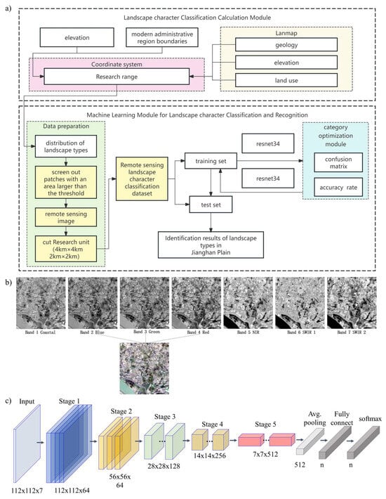 Description of system architecture. (a) Landscape character classification and recognition system; (b) remote sensing images of different channels; (c) convolutional neural network model used in classification system.