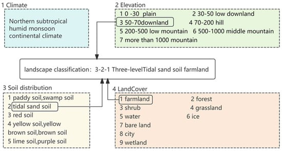 Prior to data processing, a naming convention was established to delineate the type of landscape character classification, which was achieved by overlaying data from three layers, namely soil, elevation, and land use. In this study, geological data were classified into the following five categories, informed by classifications in previous studies and the current study’s requirements: (1) paddy and swamp soil; (2) tidal sand soil; (3) red soil; (4) yellow, yellow-brown, and brown soil; and (5) lime and purple soil. The terrain data were segmented into seven categories according to elevation as follows: 0–30 plain; 30–50, low downland; 50–70, downland; 70–200, hill; 200–500, low mountain; 500–1000, middle mountain; and more than 1000, mountain. The land use classification adhered to the nine categories presented in the original data, which were farmland, forest, shrub, grassland, water, ice, bare land, city, and wetland.