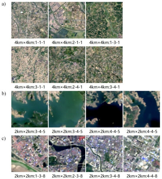Following extensive experiments, this study established 4 km × 4 km and 2 km × 2 km as the dimensions for the macro- and meso-landscape research units, respectively. A small area encompassing all landscape characters was selected from the center of the complete remote sensing image. The small area with a shape of (7531, 7691) pixels was subdivided into 4 km × 4 km and 2 km × 2 km patches. The dataset was expanded by shifting this segment by 1 km and 0.5 km each time, resulting in 9732 and 77,598 input images for macro- and meso-scale research, respectively (Table 2). Subsequently, the correlation between the remote sensing image and landscape character, as established in the previous step, was used to annotate each landscape research unit, thereby finalizing the data annotation process (Figure 6). When multiple landscape characters were present within a single study unit, the type with the largest area proportion was designated as the label. In the third step, each square was augmented and transformed into an input format comprising seven channels with a resolution of 112 × 112 pixels. During the experiment, images of various scales were divided into two groups, with 80% of the data allocated for training and 20% allocated for testing.