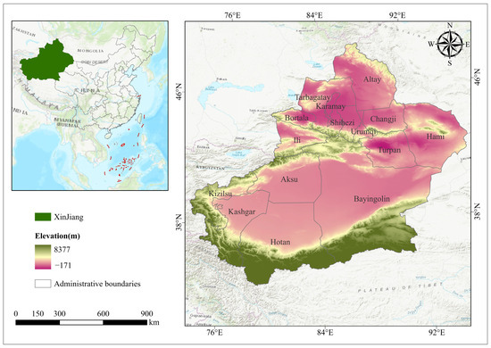 The Xinjiang Uyghur Autonomous Region is situated in the northwestern part of China’s inland (73°40′–96°18′ E, 34°25′–48°10′ N), in the heart of the Eurasian continent. The total area of the region is 1.66 million km2, and it is administratively divided into 4 prefecture-level cities, 5 prefectures, and 5 autonomous prefectures (Figure 1). Xinjiang’s topography is characterized by an alternating pattern of mountain ranges and basins. Xinjiang, being distant from the ocean, experiences a typical temperate continental arid climate characterized by sparse precipitation and high evaporation rates, with an average annual rainfall of 170.6 mm, and the primary water source for oases is the meltwater from high mountain glaciers. Xinjiang is a key agricultural reclamation region in China, with a reserve of 14.87 million km2 of farmland, the largest in the country [40]. Oases support more than 95% of the region’s population [41], making oasis agriculture the fundamental lifeline for human survival and development in Xinjiang. With the deepening of the “Belt and Road” initiative, Xinjiang has emerged as a pivotal region linking the East and the West, functioning as a key corridor and central area within the Silk Road Economic Belt. The implementation of various ecological protection projects has enabled Xinjiang to gradually achieve a green transition, leading to significant changes in land-use patterns.