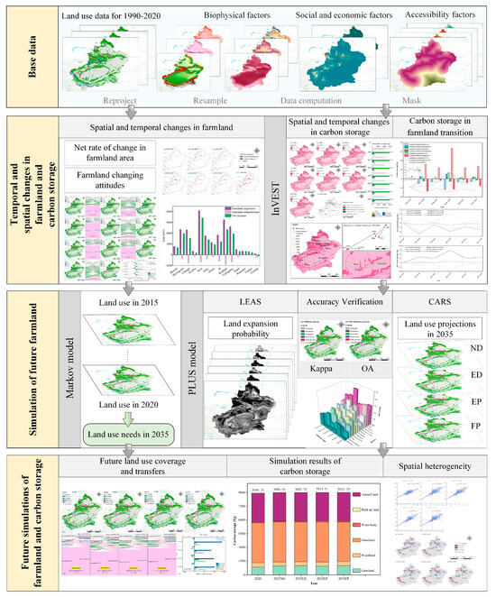 In light of the above context, this study focuses on the Xinjiang Uyghur Autonomous Region, utilizing the PLUS–InVEST model to analyze the spatiotemporal dynamics of LUCC and to assess the spatial distribution of carbon storage. The objectives of this study are as follows: (1) to explore the spatiotemporal patterns of LUCC and carbon storage changes in Xinjiang from 1990 to 2020, and to assess the impact of farmland changes on carbon storage; (2) to predict the spatiotemporal dynamics of LUCC and carbon storage under four scenarios for 2035; (3) to quantitatively evaluate the spatial association characteristics of carbon storage changes resulting from farmland changes. This study contributes to the sustainable development of the Xinjiang region and the achievement of the “dual carbon” goals.