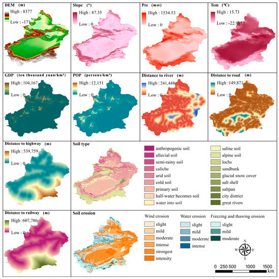 The driving factors for LUCC include natural environmental factors such as DEM, slope, annual precipitation, average annual temperature, soil type, and soil erosion; socio-economic factors like GDP and population density; and accessibility factors, including distance to railroads, highways, roads, and water bodies, calculated using ArcGIS 18.0. Detailed information is provided in Table 1. All data were standardized to a 300 m resolution with WGS1984 coordinate system.