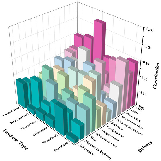 The PLUS model, developed by Liang Xun and colleagues at China University of Geosciences [35], is a LUCC model that combines a rule-mining method derived from land expansion analysis with a Cellular Automata (CA) module utilizing a multi-type random seed mechanism. This model is intended to identify the key drivers of land expansion (Figure 3). The drivers in this study include DEM; slope; average annual precipitation; average annual temperature; soil type; soil erosion; GDP; population density; and distance to railroads, highways, roads, and water bodies. The model then obtains the contribution of each driver to land use expansion (Figure 4) and assesses the impact of each driver on the expansion of different land use types. Relative to other models, the PLUS model offers a faster, more accurate depiction of landscape patterns under different future scenarios [42].