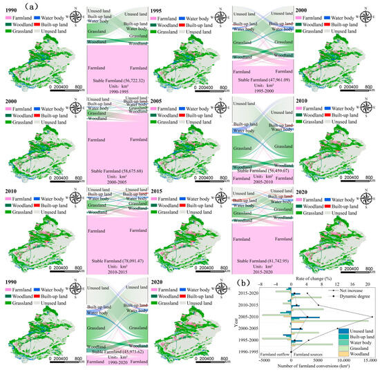 Over these 30 years (Figure 5a,b), the dynamic degree of farmland change was 1.96%, with a net change rate of 58.67%, resulting in a total increase of 33,328.53 km2. Specifically, between 1990 and 1995, the farmland area continuously decreased, with a net change rate of −0.03%. Since 1995, however, there has been a consistent trend of expansion in farmland. The period from 2005 to 2010 experienced the greatest dynamic degree and net change rate in farmland, recorded at 4.24% and 21.22%, respectively. After 2010, the rate of expansion slowed, with the slowest increase occurring between 2015 and 2020, when the dynamic degree of change was 0.85%. Since 1990, the areas of farmland expansion and loss have been 44,160.75 km2 and 10,832.22 km2, respectively. Farmland expansion predominantly originated from grassland and unused land, which contributed 64.62% and 23.68% of the total expansion, respectively. The lost farmland was mainly converted into grassland, built-up land, and woodland, representing 50.94%, 28.07%, and 11.05% of the total loss, respectively. Socio-economic development in Xinjiang has directly influenced the urbanization process, with the farmland area continuously increasing alongside population growth, leading to the expansion of oases.
