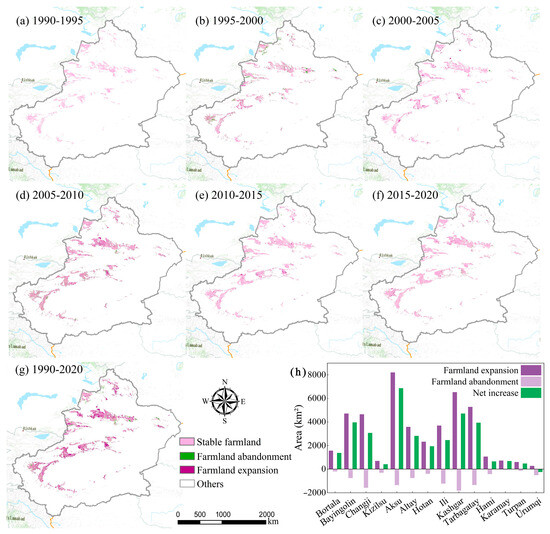 Spatially (Figure 6a–g), the changes in farmland area across Xinjiang from 1990 to 2020 show significant variation. The newly supplemented farmland mainly came from the southern edge of the Junggar Basin and the northern and western parts of the Tarim Basin, forming a ring-like distribution around the basins. Specifically (Figure 6h), the Aksu, Kashgar, and Tacheng regions contributed significantly to farmland supplementation, accounting for 46.80% of the total farmland area in Xinjiang. Over the 30-year period, most of the newly added farmland came from these three regions, with increases of 8199.99 km2, 6515.19 km2, and 5271.75 km2, respectively. These areas have relatively low levels of economic development and are primarily agriculture-based, with farmland expansion used to further boost agricultural production. In contrast, the regions where farmland has been occupied are primarily those experiencing rapid economic development. Urumqi, in particular, shows a net negative change in farmland area, with significant farmland occupation. In other regions, however, farmland generally increased.