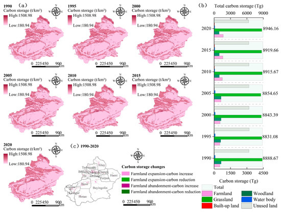 The spatial patterns of carbon storage distribution in Xinjiang demonstrate considerable spatial variability (Figure 7a). Areas with high carbon storage values are predominantly found in the Altai Mountains in the north, the Ili River Valley, the Tianshan Mountains in the central region, and along the northern periphery of the Tarim Basin. These areas have a high forest cover, resulting in high carbon density values. Low-value areas are primarily located in the vast desert and Gobi regions at the center of the basin. The carbon storage results for each five-year period from 1990 to 2020 are 8888.67 Tg, 8831.08 Tg, 8843.39 Tg, 8854.65 Tg, 8915.67 Tg, 8919.66 Tg, and 8946.16 Tg, respectively (Figure 7b). Overall, from 1990 to 2020, the carbon storage in Xinjiang’s terrestrial ecosystems initially decreased before experiencing an increase, with a total increase of 57.49 Tg over 30 years. Specifically, between 1990 and 1995, the carbon storage decreased by 57.58 Tg. Between 1995 and 2020, the government implemented numerous environmental protection measures in areas such as desertification control, ecological parks, national nature reserves, and ecological restoration projects, leading to an upward trend in carbon storage, with an increase of approximately 115.08 Tg, an average annual increase of 4.60 Tg. With regard to various LUCCs, the contribution of farmland to carbon storage increased from 5.95% in 1990 to 9.37% in 2020. Despite the relatively low carbon density of unused land and grassland, these land types cover over 90.00% of the total area within the study region, contributing approximately 89.94% to the overall carbon storage.