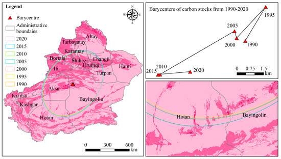 The centroid shift model and standard deviation ellipse were used to visually analyze the status and directional changes of carbon storage in Xinjiang (Figure 8). The study found that the centroid of carbon storage was located in the northwestern part of Bayingolin Mongol Autonomous Prefecture. From 1990 to 2020, the centroid showed an overall southwestward shift, moving a total of 11.54 km, indicating that the growth in carbon storage in the southwestern region was significantly higher than that in the northeastern region. Regarding the direction of change, the spatial distribution displayed a northeast-to-southwest orientation. The area of the standard ellipse gradually increased, suggesting that the development trend of carbon storage in Xinjiang was unstable, with marked spatial variability.