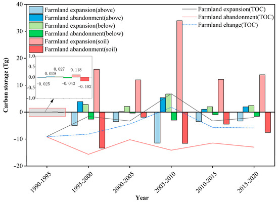 As outlined in the Sixth Assessment Report by the Intergovernmental Panel on Climate Change (IPCC), atmospheric greenhouse gas emissions persist in increasing, reaching historical peak levels [1]. Global warming caused by massive carbon emissions has become a serious climate issue for human society, posing a risk to both human and natural systems [2]. Carbon storage is widely recognized as an important indicator of ecosystem carbon storage services, and carbon in terrestrial ecosystems plays an important role in mitigating global warming [3,4,5]. Land use and cover change (LUCC) can directly impact the terrestrial carbon balance [6]. Processes including the expansion of farmland, deforestation, degradation of pastures, and urbanization modify soil and vegetation [7,8,9], making these activities the second largest contributor to carbon emissions following energy consumption [10]. LUCC is estimated to have resulted in carbon emissions of 145 ± 16 Pg C between 1850 and 2020, which is about 10% of the total anthropogenic carbon emissions [11]. Global farmland expansion has accelerated over the past two decades, with the annual rate of expansion nearly doubling [12]. Farmland, as an important component of terrestrial ecosystems, influences the global carbon cycle [13]. In response to climate change, in 2020, China announced its goals to achieve “peak carbon emissions by 2030 and carbon neutrality by 2060”, incorporating these goals into the 14th Five-Year Plan [14,15]. In this context, the study of the impact of land use changes on ecosystem carbon storage, especially the role of changes in farmland on carbon storage, has become an important issue in the fight against global warming.
