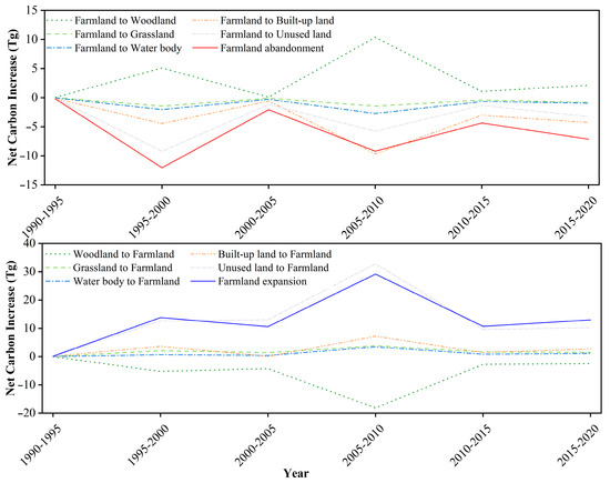 The effect of converting farmland into other land use types on the net increase in regional carbon storage differs significantly (Figure 10). Conversion of farmland to grassland, water bodies, built-up areas, or unused land leads to an increase in regional carbon emissions, whereas converting farmland to woodland enhances regional carbon storage and reduces carbon emissions. Specifically, during the process of farmland loss, the net increases in carbon storage were all negative, and farmland conversion to built-up land had the greatest impact, causing carbon emissions of 14.37 Tg, accounting for 62.75% of the carbon emissions caused by farmland loss. The changes in carbon storage caused by the conversion of farmland to woodland, grassland, water body, and unused land were 8.93 Tg, −1.47 Tg, −2.87 Tg, and −4.19 Tg, respectively. The process of compensating for farmland favors the increase in carbon storage in the Xinjiang region. Reclamation of unused land into farmland is the type of land use change that has the greatest impact on the regional carbon balance, and during the 30-year period, the carbon increment caused by the conversion of unused land into farmland was 64.08 Tg, which is about 70.16% of the total carbon increment. The carbon increments caused by the transfer of woodland, grassland, water bodies, and built-up land into farmland were −23.41 Tg, 7.61 Tg, 3.21 Tg, and 7.51 Tg, respectively.