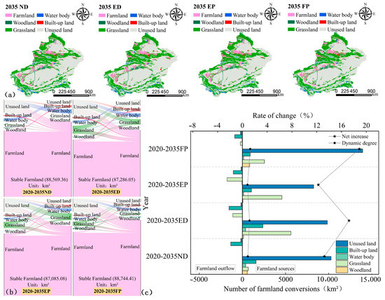 Between 2020 and 2035, the area of farmland and built-up land increases in different scenarios, and unused land is the main source of both (Figure 11a,b). The expansion of farmland area is estimated to be 13.2%, 17.2%, 12.3%, and 18.9% under the ND scenario, ED scenario, EP scenario, and FP scenario, respectively. The net change in farmland area reaches its maximum under the FP scenario (Figure 11c), with the increase mainly concentrated in the Ili Valley, the economic zone on the northern slopes of the Tianshan Mountains, and the zone along the southern edge of the Tarim Basin. Under the ND scenario, following the historical evolution of land use, the area of farmland, built-up land, and water bodies increases, while the area of unused land continues to decrease. In the ED scenario, due to the rapid urbanization process, there is a significant expansion of farmland and built-up land, with a reduction of 0.82% in grassland, part of which is degraded to unused land and part of which is converted mainly to farmland. The EP scenario emphasizes environmental conservation, resulting in a 1% decrease in woodland and increases in grassland and water bodies by 0.18% and 4.98%, respectively. Compared with other scenarios, ecological land types such as woodland, grassland, and water bodies are better preserved under this scenario. In the FP scenario, strict measures are taken to protect farmland, limiting its conversion to other land types. As a result, farmland area increases the most among the four scenarios, while grassland decreases the most, with changes of 18.88% and −0.97%, respectively. However, this scenario places considerable constraints on the growth of built-up areas, resulting in an expansion of built-up land that is roughly 640.05 km2 smaller compared with the other three scenarios.