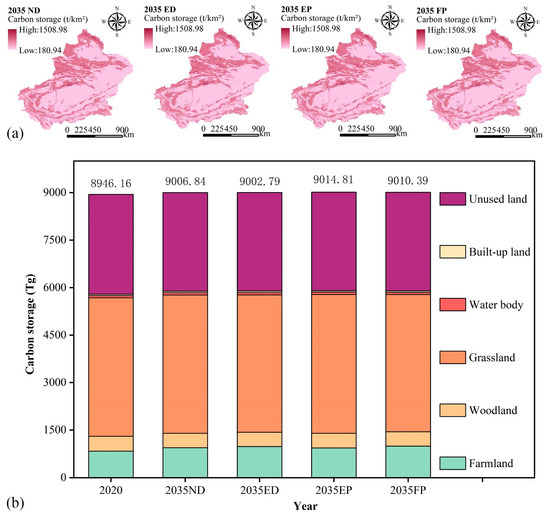 (a) Carbon storage under the natural development (ND), economic development (ED), ecological protection (EP), and farmland protection (FP) scenarios in 2035. (b) Carbon storage values under different land types, 2020–2035.