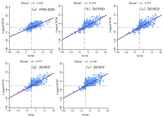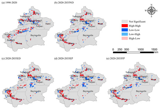 In order to reveal the spatial clustering characteristics of carbon storage changes due to the transformation of farmland utilization in Xinjiang, a global spatial autocorrelation analysis of carbon storage changes due to the transformation of farmland utilization in Xinjiang under four scenarios from 1990 to 2020 and 2020 to 2035 was conducted using Geoda software 1.20. (Figure 13). The global Moran’s I values are 0.424 (1990–2020), 0.554 (ND), 0.557 (ED), 0.557 (EP), and 0.550 (FP). The indices of all periods are greater than 0, indicating that the changes in carbon storage resulting from farmland utilization transformation exhibit a significant spatial positive correlation with a clear spatial clustering effect.