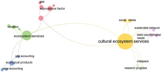 According to keyword clustering (Figure 2), the terms “cultural ecosystem services”, “ecosystem services”, and “ecological products” had the highest frequencies of occurrence. “Cultural ecosystem services” showed a strong correlation with “social media”. Social media data have the advantages of easy accessibility, long time spans, and large volumes. Additionally, through further text extraction and analysis of social media information, it is possible to obtain more specific perceptions and feelings of users about particular activity venues. Therefore, social media data provide valuable new sources and methods for evaluating urban park scene perceptions [50,51,52]. “Ecosystem services” was closely related to “value assessment”. Ecosystem services serve as the bridge connecting ecosystem structure, processes, and human well-being. Valuing them provides a reliable basis for assessing changes in ecosystem quality and formulating payment policies for ecosystem services, which promotes ecosystem conservation and ecological civilization construction [10]. The term “ecological products” had the highest co-occurrence frequency with “value accounting” and “GEP accounting”. This indicated that people recognize that ecological products are not merely natural resources themselves but also valuable goods and services [53,54,55,56,57]. Through value accounting and GEP accounting, these intangible values can be quantified, making them more intuitively recognizable and understandable to the public, thereby better promoting ecological conservation and rational utilization.
