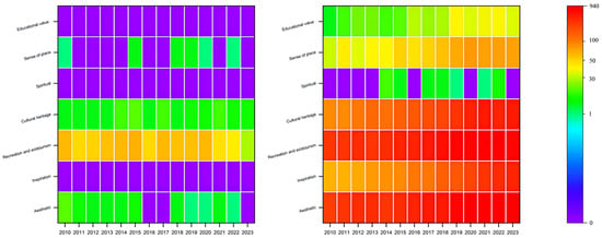 As shown in Figure 4, the research literature on specific categories of CESs retrieved from WOS exhibited certain trends. From the perspective of the total number of papers, the literature on aesthetic value accounted for the largest proportion, nearly 35%. Papers on recreation and ecotourism accounted for nearly 34%, while the literature on cultural heritage made up nearly 16%. In terms of trends, from 2010 to 2023, the number of studies involving categories such as recreation and ecotourism, educational value, cultural heritage, and inspiration continuously increased, indicating growing research interest and attention in these fields. In contrast, the number of studies on categories like aesthetic value, sense of place, and spiritual and religious values showed fluctuations and was generally lower. This may suggest that research in these areas was more challenging or received less attention compared to the others [75,76]. Notably, the volume of research related to recreation and ecotourism, and educational value remained consistently high. This indicates that the cultural ecosystem services values of these two areas received extensive attention and in-depth research. Furthermore, these studies primarily focused on natural environments such as water and woodland as subjects, reflecting the importance of these types of environments in providing relevant services [35].