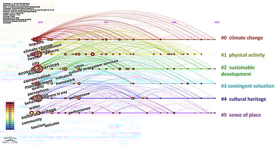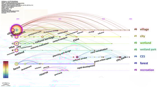 Figure 7 displays a timeline diagram of keywords used in foreign research, including “climate change”, “physical activity”, “sustainable development”, “contingent valuation”, “cultural heritage”, and “sense of place”. These clusters reflect the research directions related to CESs based on LUCC and represent the key areas of focus for scholars over the years. This research can be divided into two periods. The first period spanned from 2010 to 2015, during which the keywords were most dense, focusing mainly on “conservation”, “perception”, “biodiversity”, “quality”, and “recreation”. In this phase, the research trends of keywords such as “impacts”, “biodiversity”, “cultural heritage”, and “conservation” gradually strengthened, with many continuing to the present. This indicates that foreign scholars were integrating the CESs of LUCC with other ecosystem content, which remains a hot topic of research. The second period extended from 2015 to 2023. During this stage, the concept and classification of CESs matured. The research hotspots from the previous period continued to be prominent in this phase. Notably, some studies began to shift toward evaluating the values of specific LUCC classifications. Based on the keyword timeline graph, it is evident that scholars placed great emphasis on environmental protection, biodiversity, and cultural heritage conservation. As crucial components of the entire ecosystem, the value and significance of CESs in the land use system gradually received increased attention. During this period, numerous significant events related to the ecological environment occurred globally, for example, the Australian bushfires and the Amazon rainforest fires. This succession of ecological events has propelled ecological issues to the forefront of human public affairs.