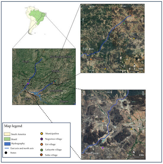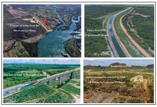 The São Francisco River Integration Project (PISF—Projeto de Integração do Rio São Francisco, in Portuguese), implemented since 2007 and currently in its final stages of construction work, aims to transfer (divert) water from the river of the same name and interconnect it with other river basins located in the northern states of Paraíba (PB), Pernambuco (PE), Rio Grande do Norte (RN), and Ceará (CE). This water project is the responsibility of the current Ministry of Regional Development (MDR), formerly the Ministry of National Integration (MIN), and its main objective is to ensure a regular water supply for approximately 12 million inhabitants in the Agreste and Sertão [backland] segments of the aforementioned states [17]. The project collects water at two points on the São Francisco River, and the water flows along two main axes, east and north, covering 477 kilometres, in addition to several associated axes (these are secondary works, the responsibility of the states), for integration with other basins in the northern Northeast.