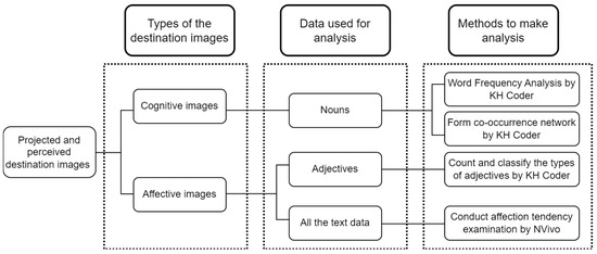 Previous research has proved the effectiveness of extracting nouns inside the text data to analyze the dimensions and relationship between cognitive images through text mining [59]. To explore the affective destination images, previous research labeled and categorized adjectives in the text data and conducted an affection tendency examination [59]. These methods can be achieved by using semantic analysis software [59,100], computer languages, including Python [101], or online websites [111].