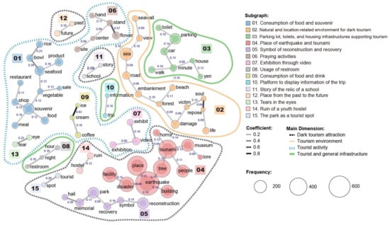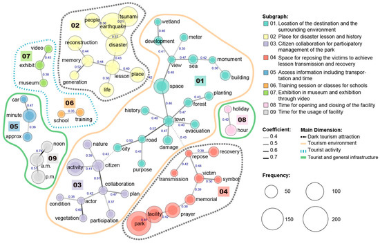 For the projected destination image, the co-occurrence network analysis formed nine distinct subgraphs. After analyzing the meaning behind each subgraph, we categorized them into five broader groups based on thematic similarity. As for the perceived destination image, the co-occurrence network generated 15 subgraphs, which were subsequently grouped into six broader categories.