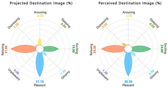 The results of the word frequency analysis were shown by Pyplutchik [121] and illustrated in Figure 6. “Pleasant” and “Relaxing” were the main affections of both the projected and perceived destination images. Although there was little difference in the percentage of these two affections, DMOs’ feelings of pleasure and relaxation stemmed more from the introduction and description of park activities, group organizations, and viewing spots. On the other hand, visitors associated these affections more with the architecture, beautiful scenery, agricultural products for sale, and activities in the parks. “Exciting”, as the third affection on both sides, demonstrates a gap where the exciting (19.9%) affection from tourists was higher than that from the DMOs (24.0%). The original text shows that DMOs majorly expressed this sentiment when describing attractive activities and facilities and the will to recover from the disaster towards revitalization.