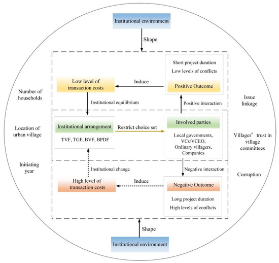 The level of transaction costs can explain the outcomes of UVRPs, such as the levels of conflict and project duration, which are common criteria for assessing institutional arrangements. However, few studies have analyzed these relationships from the perspective of new institutional economics. New institutional economists often assume that high transaction costs are conducive to inefficient institutional arrangements, which calls for institutional change to improve institutional performance. The common classification method that divides the institutional arrangement of urban village reconstruction into state-led and market-led is not clear enough. So, according to Yuan et al. [39], institutional arrangements can be divided into four groups based on the two dimensions of decision-making and funding sources: bottom-up with private developer funding (BPDF), bottom-up with villager funding (BVF), top-down with government funding (TGF), and top-down with villager funding (TVF). Figure 1 illustrates the analytical framework used in the study.